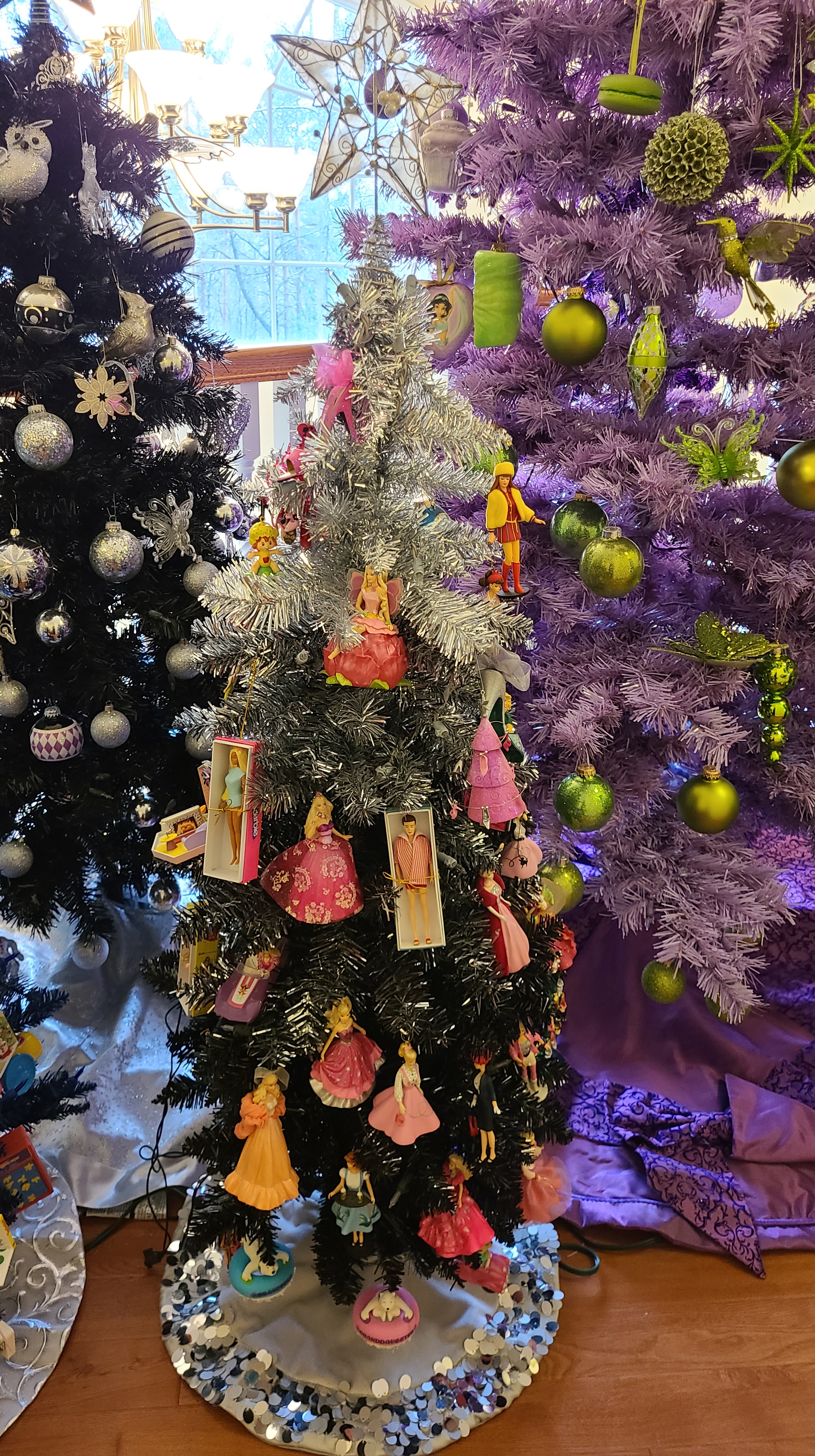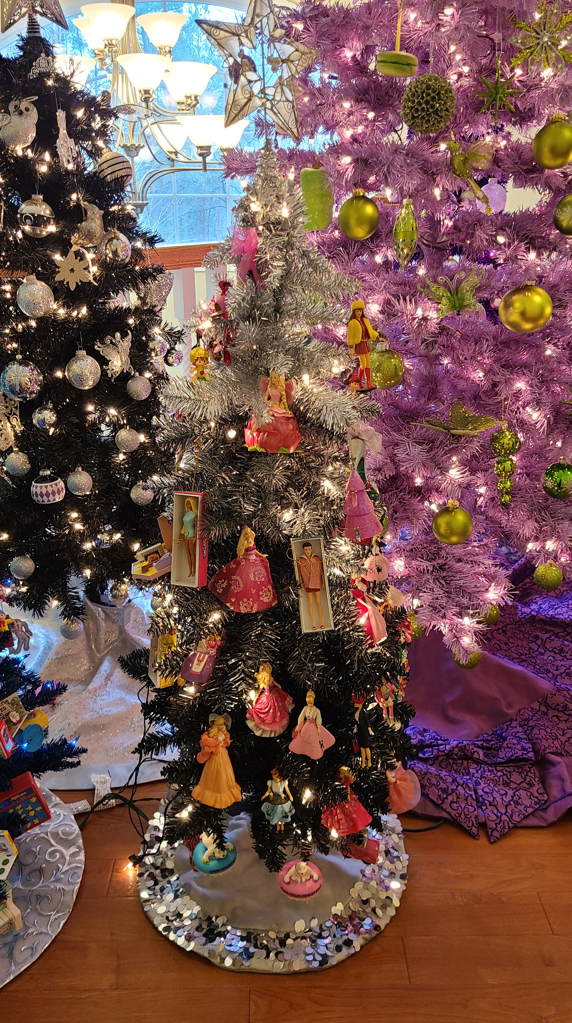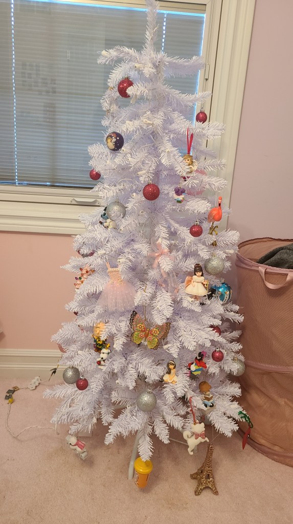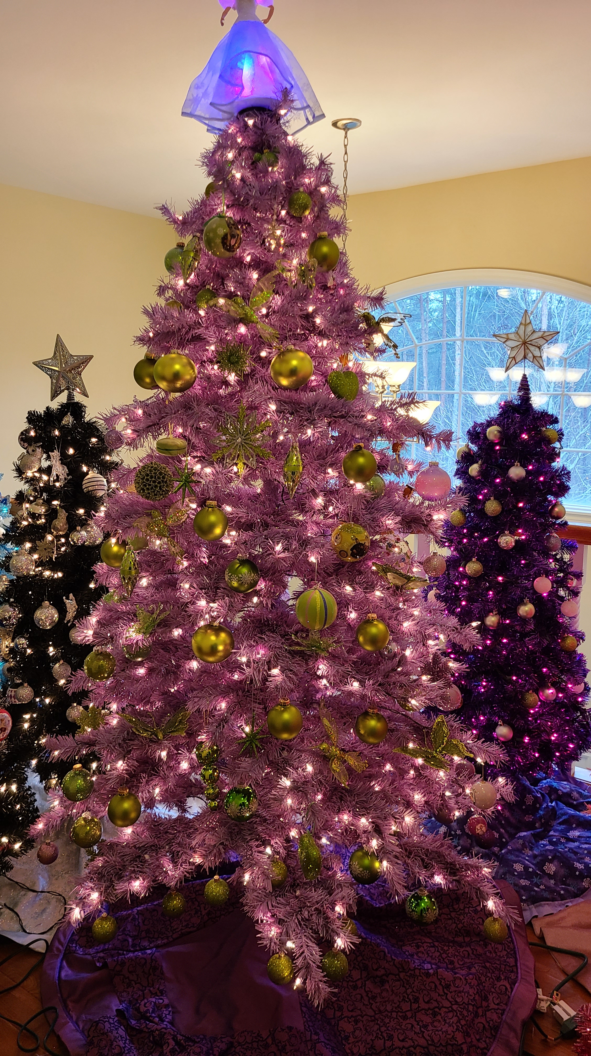Number 26 is pink with pink ornaments. The tree itself is new because the old pink tree had finally shed more needles than were left on the tree.