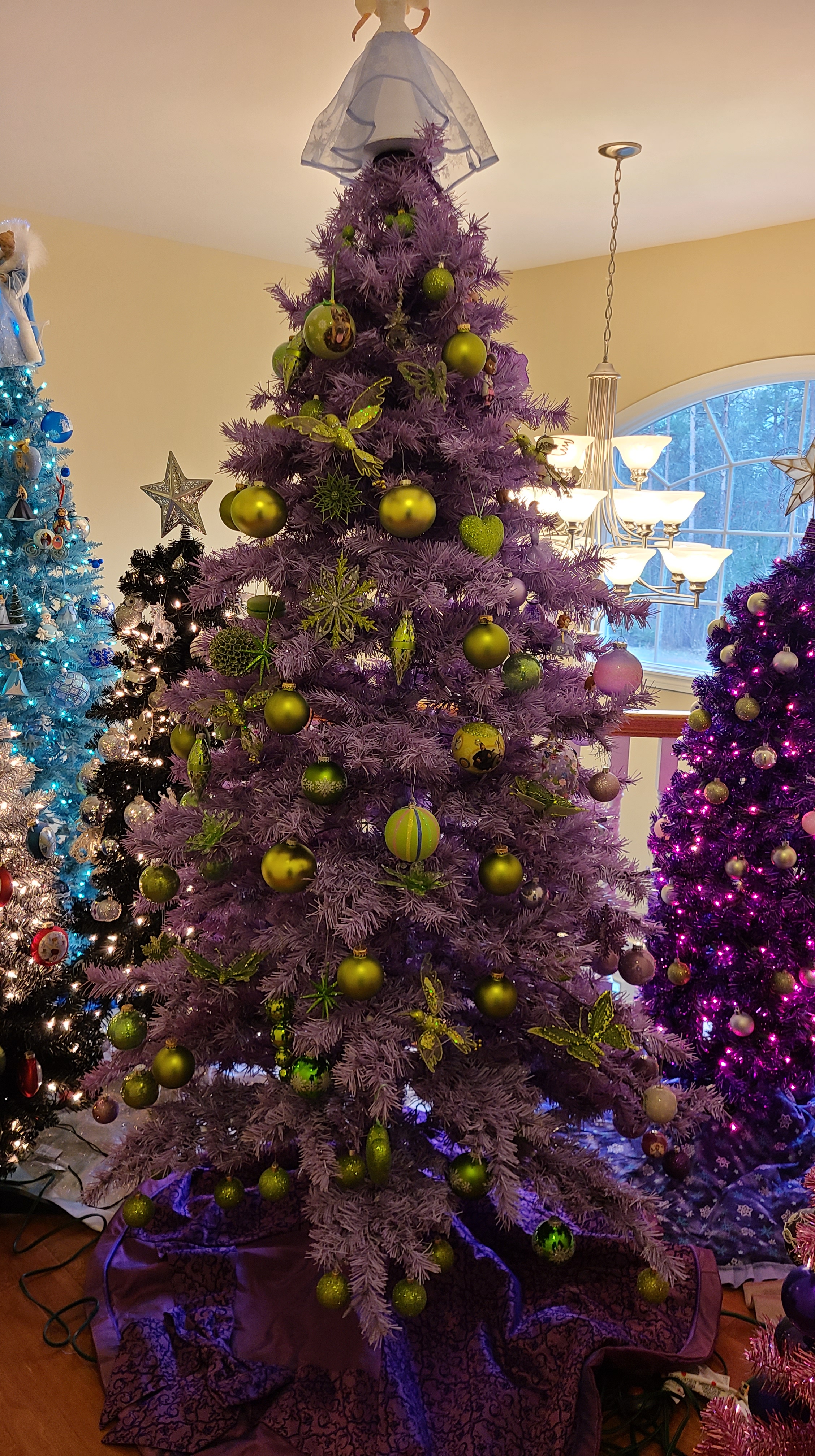 Lilac tree with lime green ornaments on one side and purple ornaments on the other (#27).