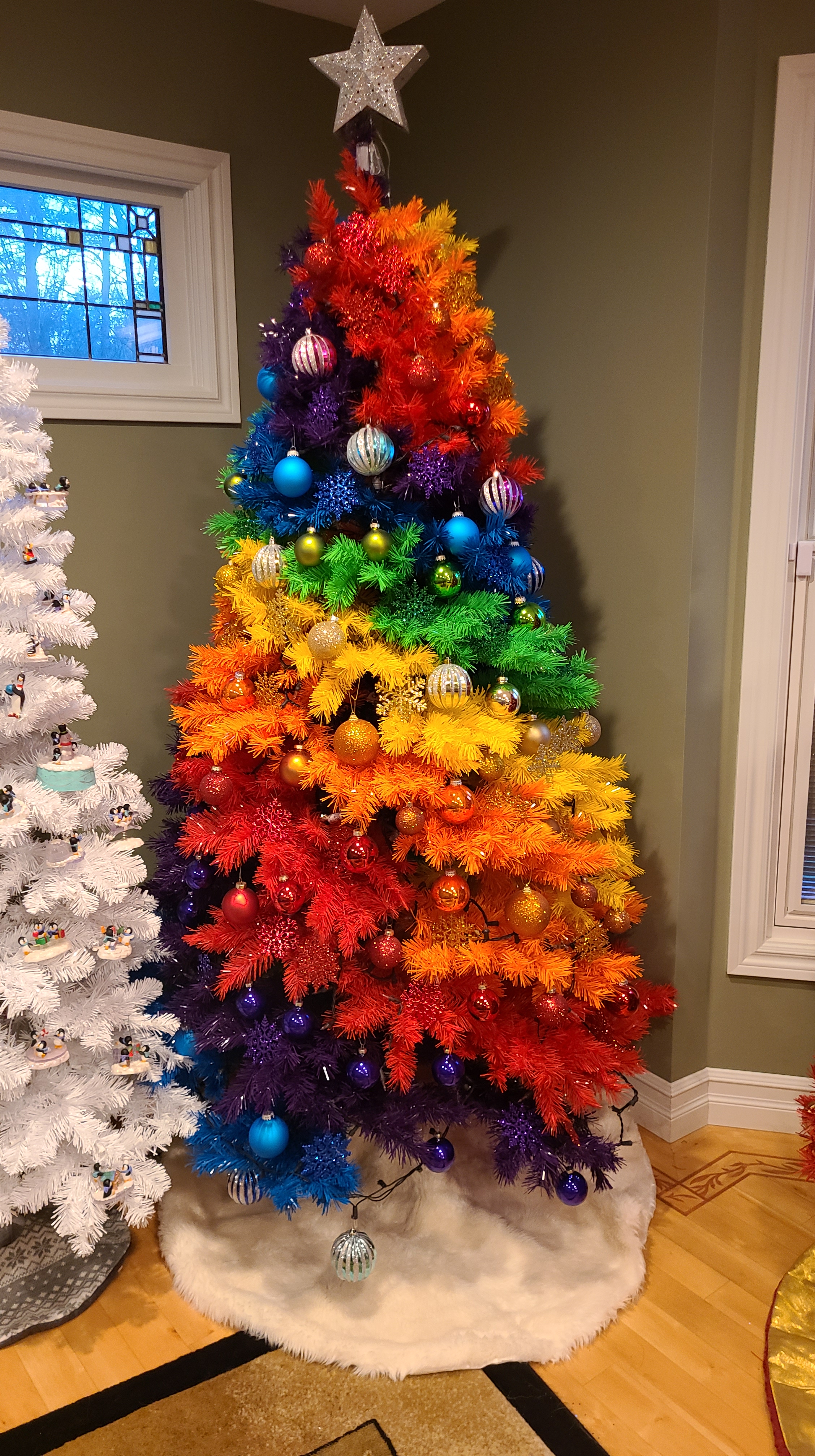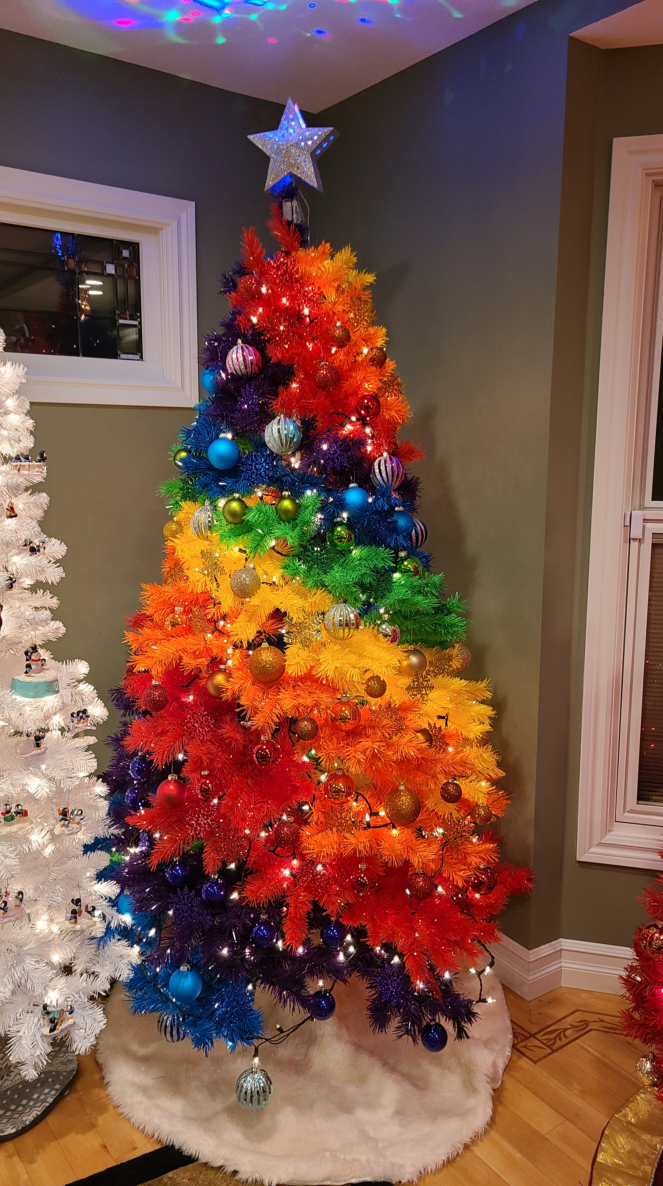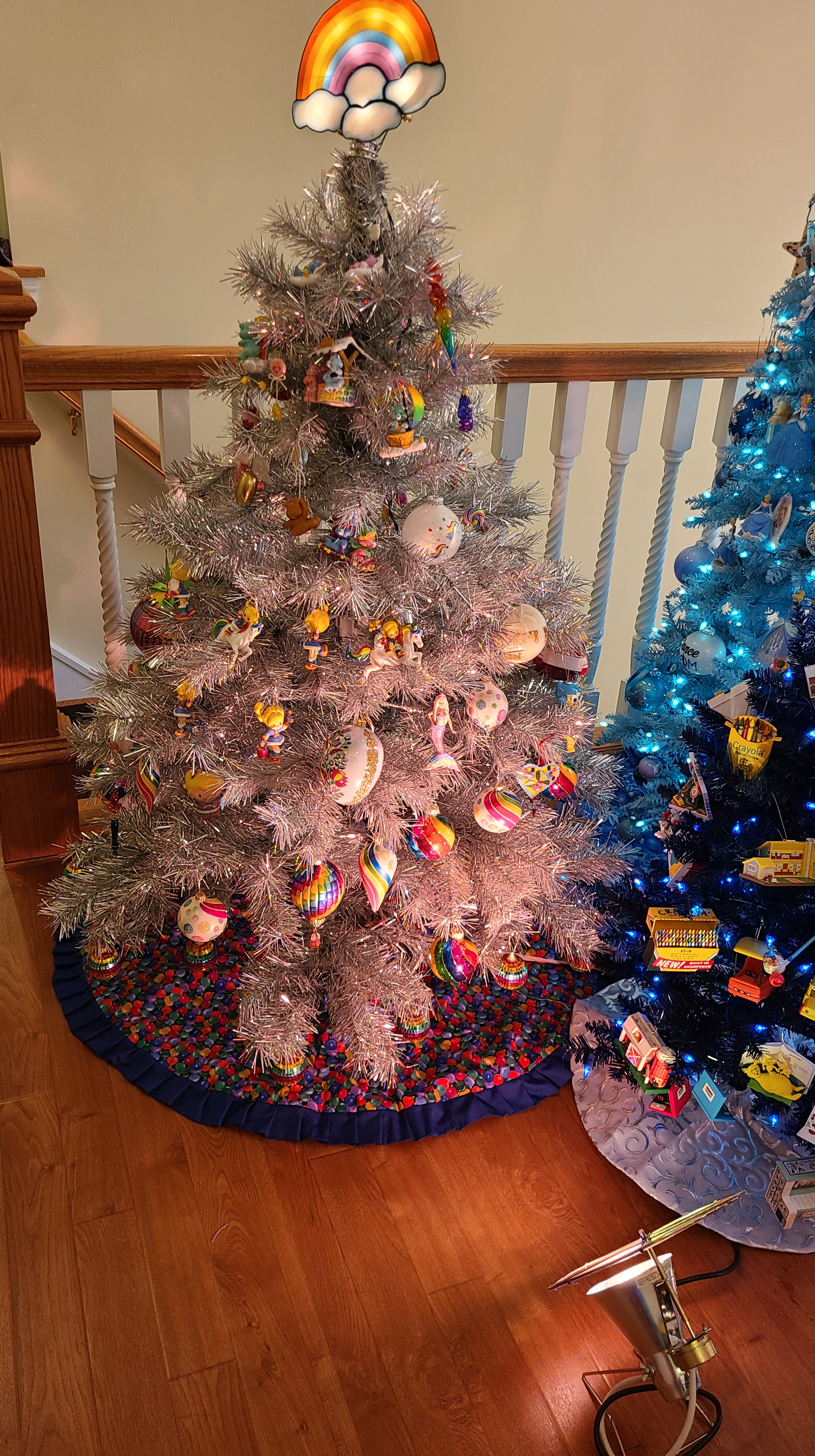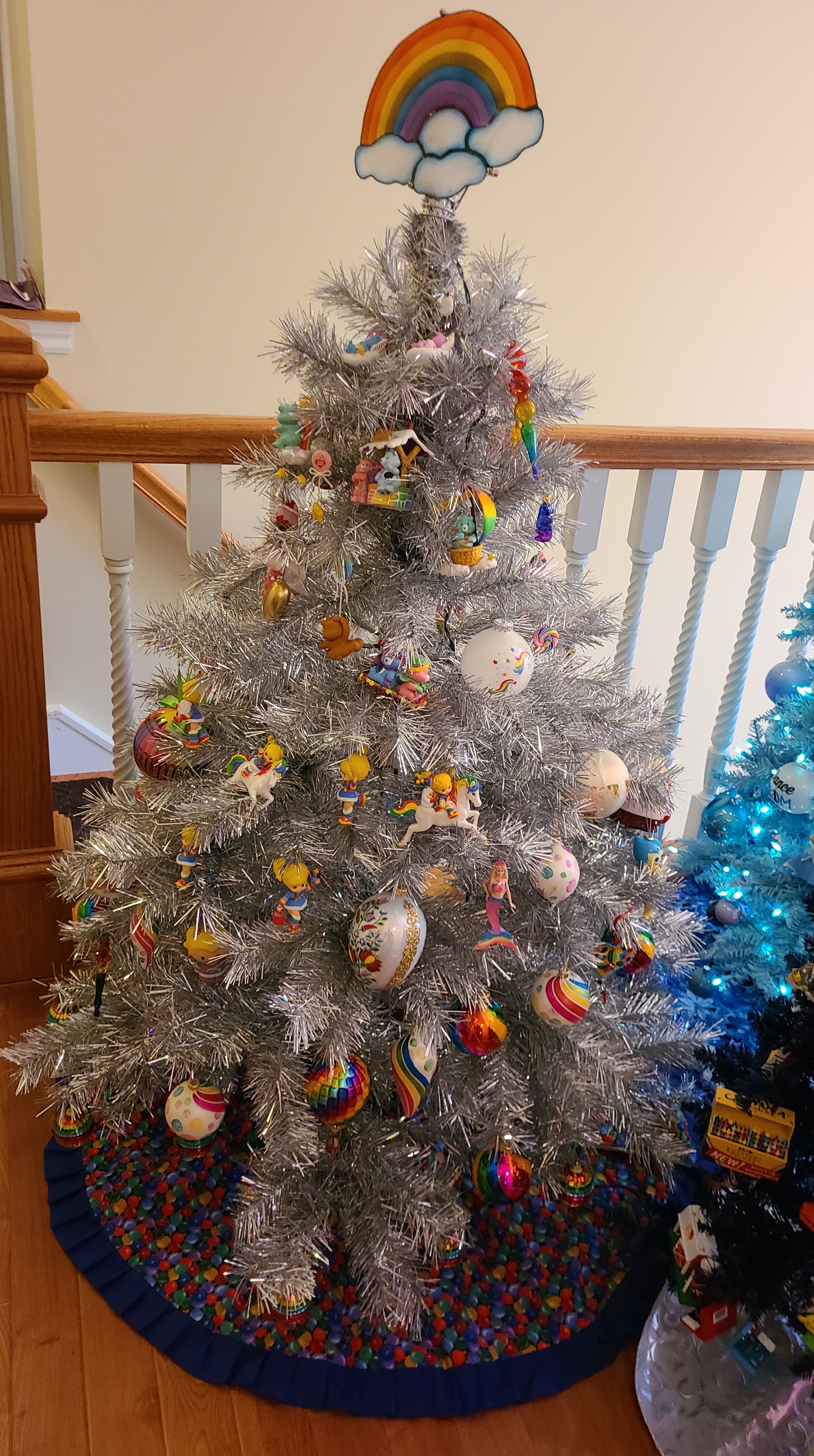 Silver tree with rainbow ornaments lit by color wheel (#31).