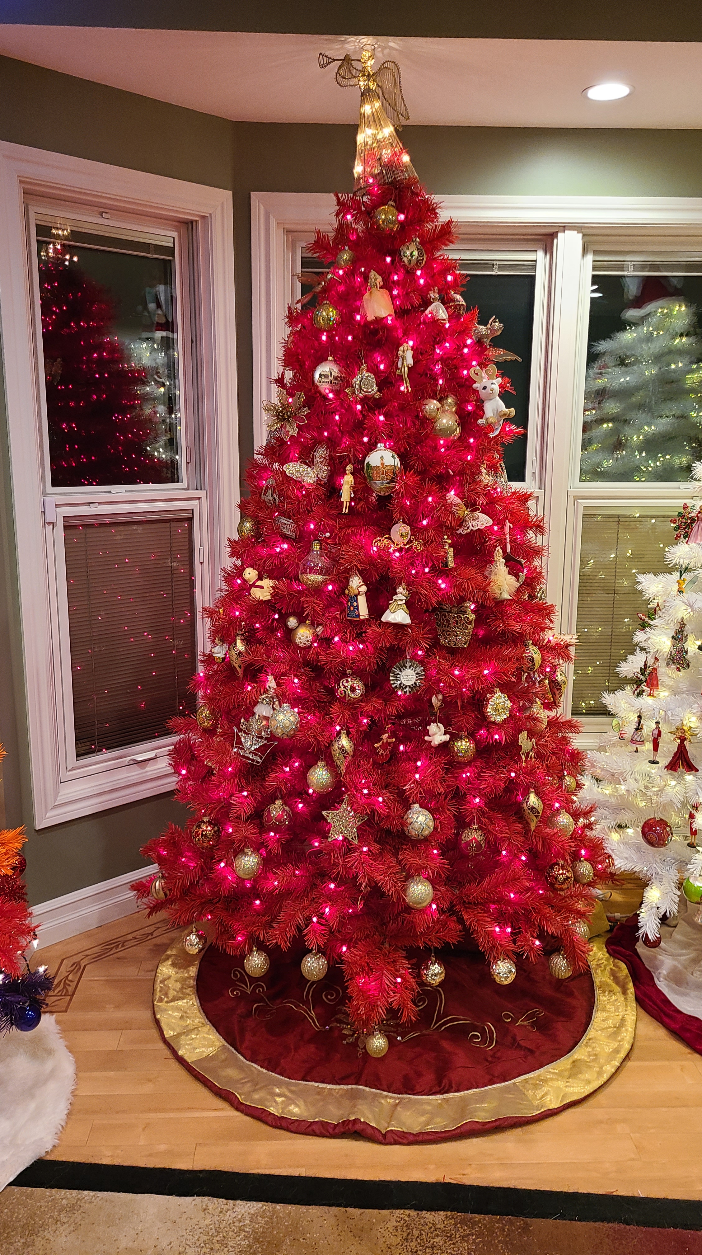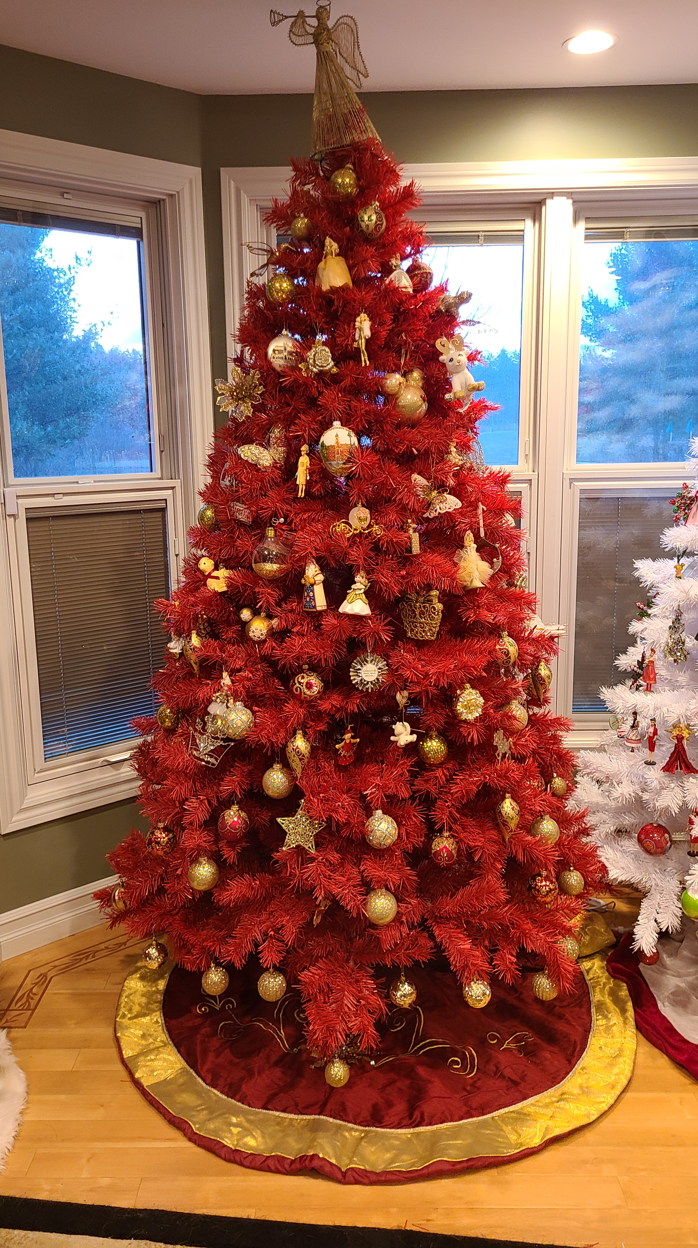 Red with gold ornaments (#5). Lost a bunch of the ornaments this year due to water leaking into one of the ornament boxes sometime in the last 11 months.