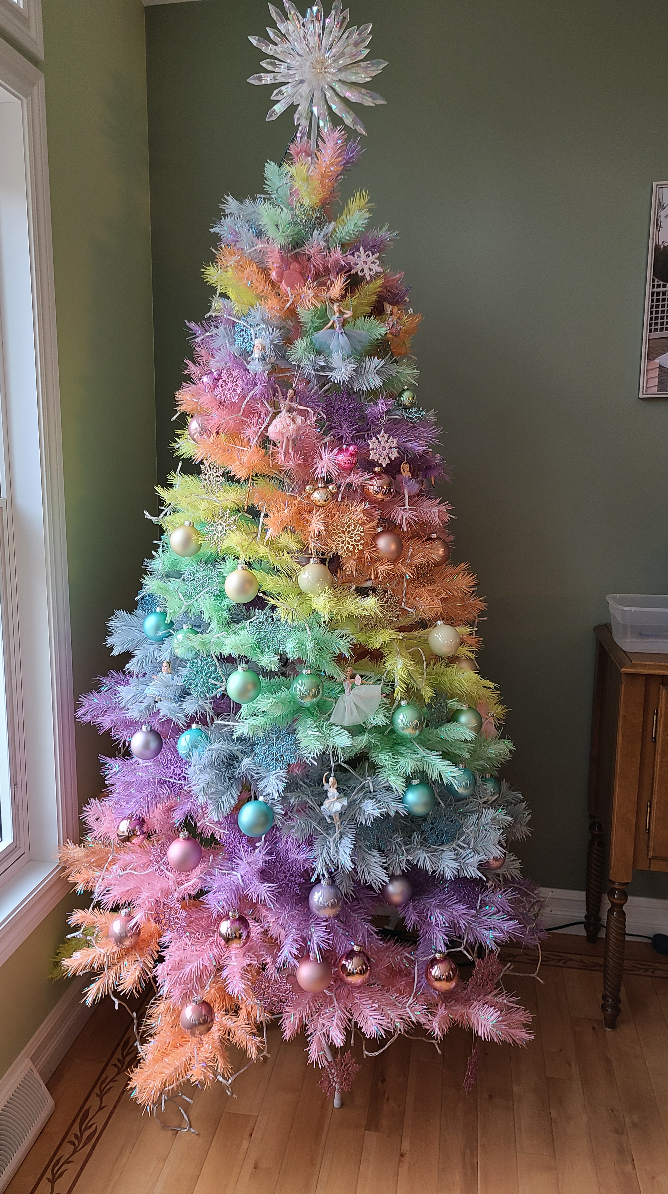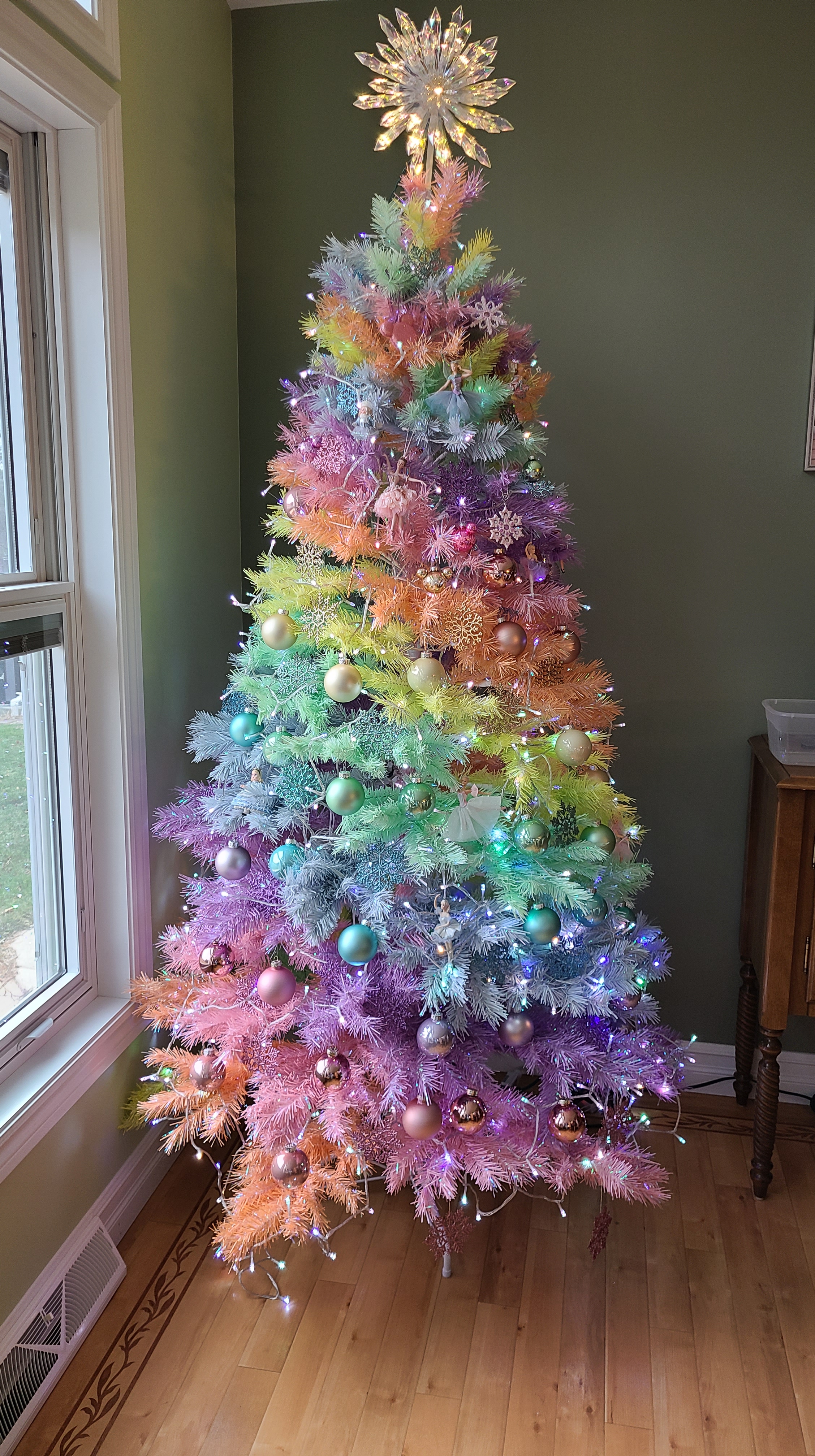 Number 16 is new this year. It is a cousin to the rainbow tree in the family room, but in pastels. It is definitely our wedding colors. It is decorated with corresponding pastel colored ornaments.
